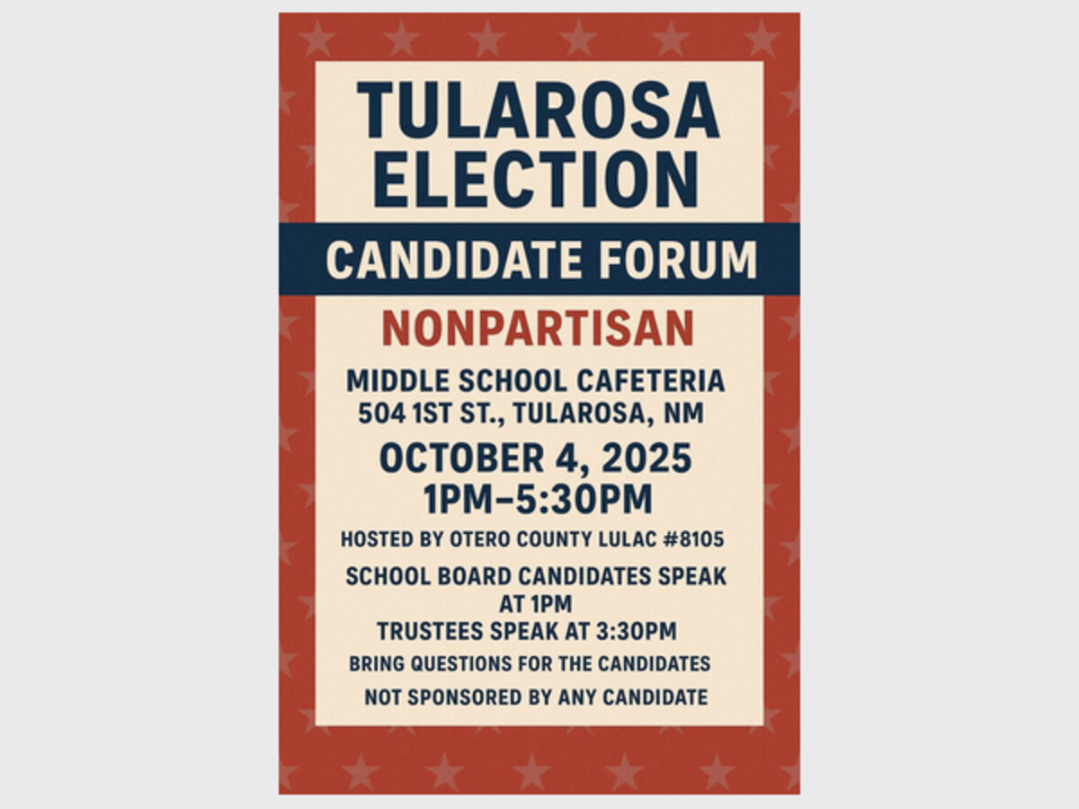 Join for a community forum hosted by LULAC 8105 and hosted by Claudia Powell former president Otero County League of Women's Voters and Chris Edwards 2nd Life Media. School Trustees forum 1 pm Village Trustees forum 330 pm