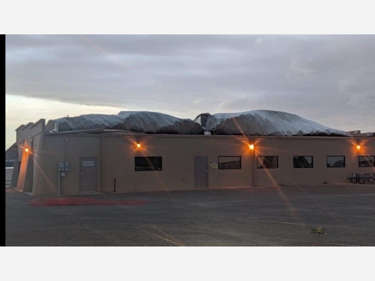 The Mountain View Dental Office took a hit T-Storm wind gusts blew the roof off of her work office. Katlyln Stevens took this photo at 7:26 PM MDT and reports “Due to the conditions resulting from this evening storm our office will be closed tomorrow June 6th until further notice. We apologize for any inconvenience this may cause. We will keep everyone updated as we receive updates. Thank you for your patience.”