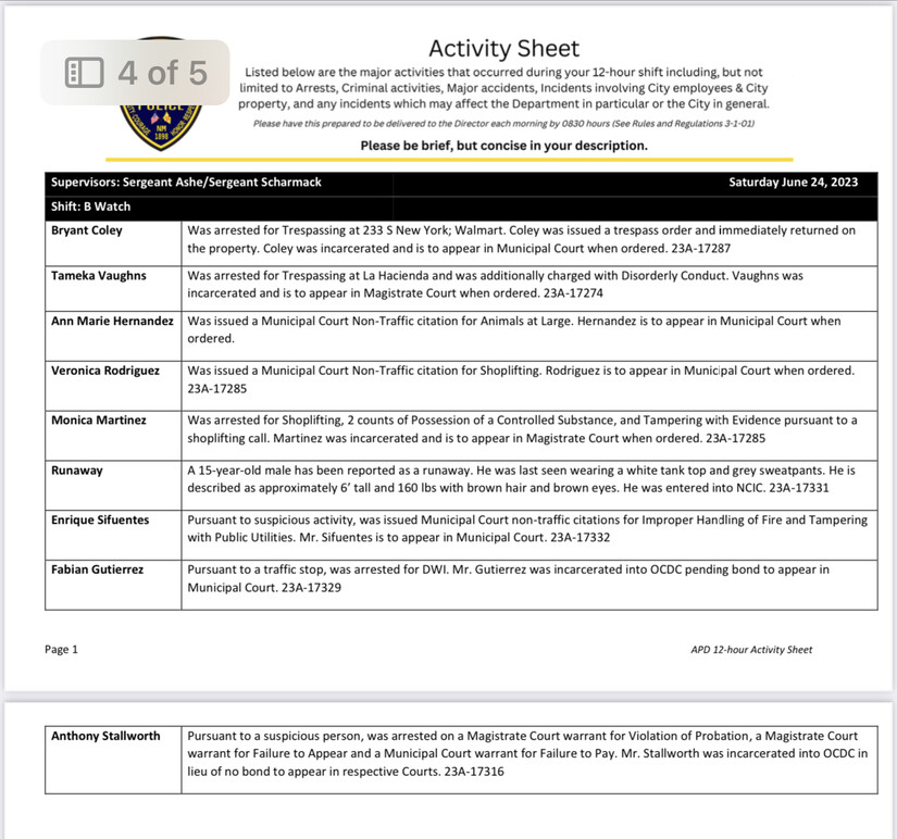 All individuals listed in the activity logs are presumed innocent until proven guilty, the logs are produced by the Alamogordo Police Department and provided as a public service of transparency.