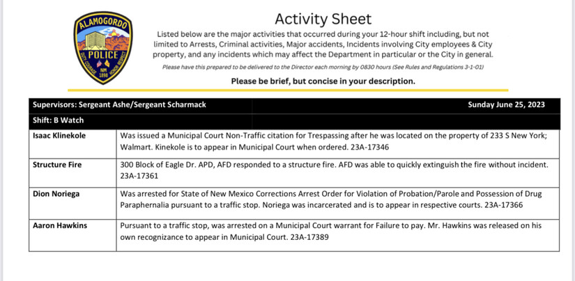This log covers the period of June 23 thru 25th, 2023 and will be an ongoing feature of AlamogordoTownNews.com and Krazy KALHRadio.org. AlamogordoTownNews.com nor KALHRadio.org is not responsible for the content not name’s presented.