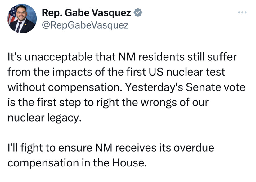 “Nearly eight decades after the Trinity Test in New Mexico, many New Mexicans are still left out of the original RECA program,” said US Sen. Ben Ray Luján, D-NM, who has introduced RECA legislation annually since being elected to the US House in 2008.