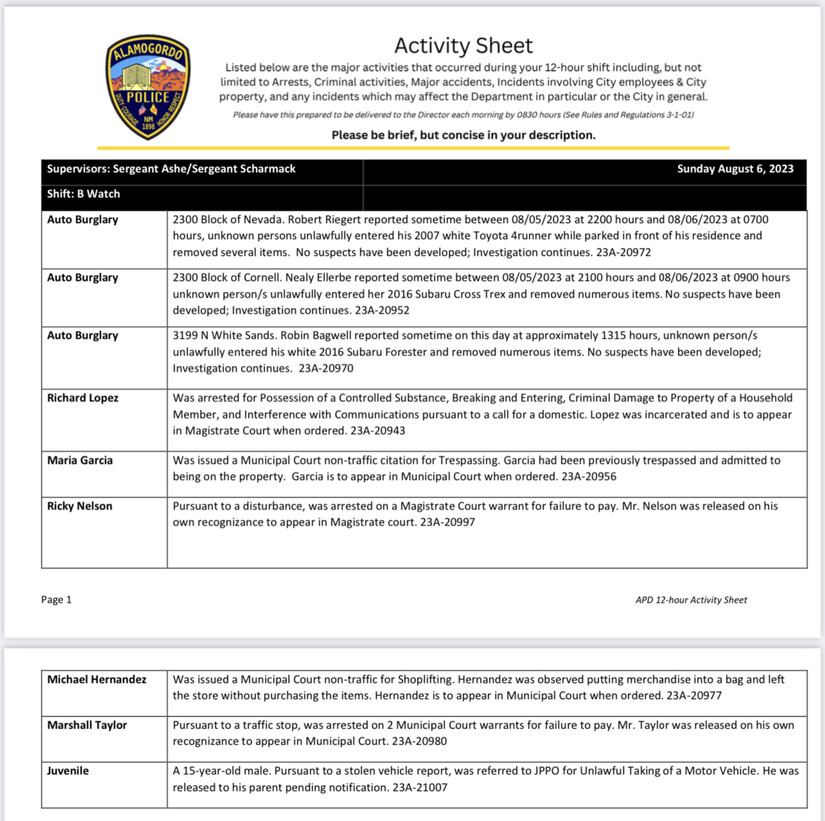 Listed the activity logs are the major activities that have occurred during the listed date range. This does not include all calls for service the Alamogordo Police Department responded to during the time frame. Additional information regarding these incidents can be requested on our website through 'Request a Report' or by contacting the Alamogordo Police Department Records Division at 575-439-4300