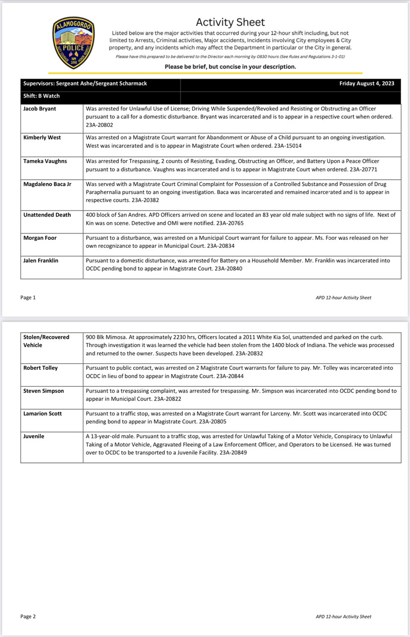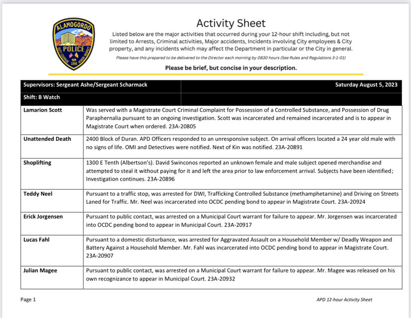 All individuals listed in the activity logs are presumed innocent until proven guilty, the logs are produced by the Alamogordo Police Department and provided as a public service of transparency.