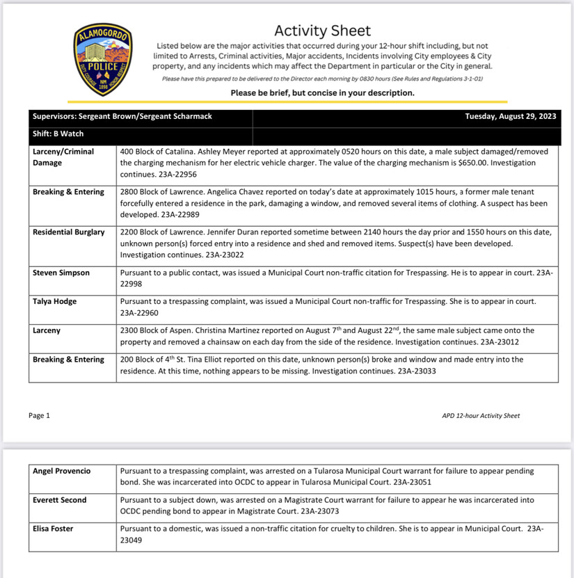 This log covers the period of August 29th, 2023 and will be an ongoing feature of AlamogordoTownNews.com and Krazy KALHRadio.org. AlamogordoTownNews.com nor KALHRadio.org is not responsible for the content