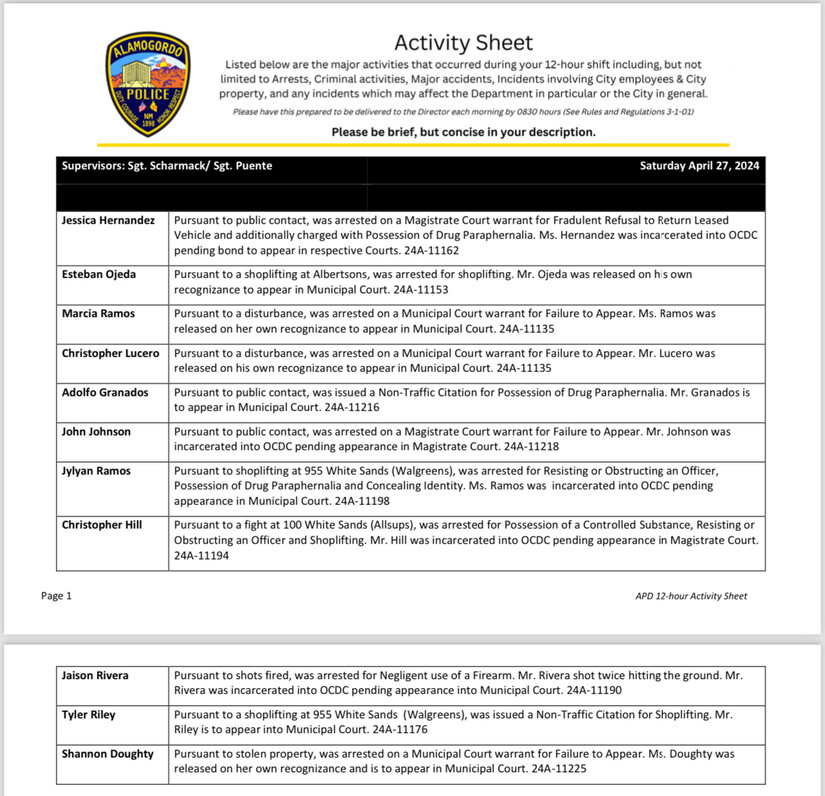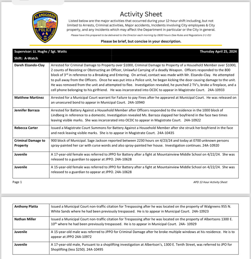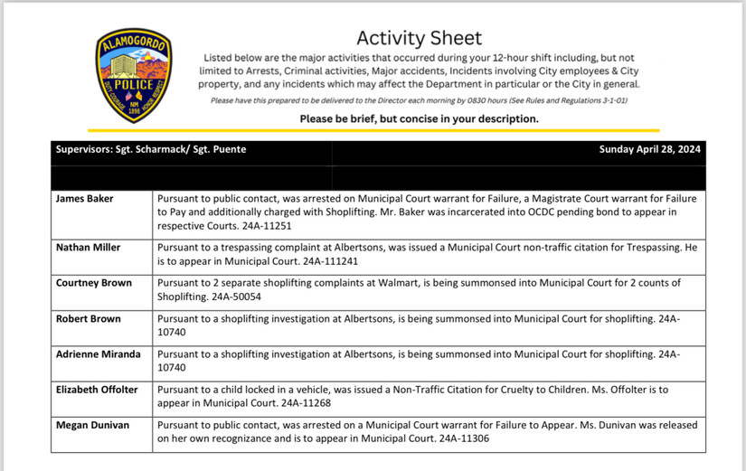 All individuals listed in the activity logs are presumed innocent until proven guilty, the logs are produced by the Alamogordo Police Department and provided as a public service of transparency.
