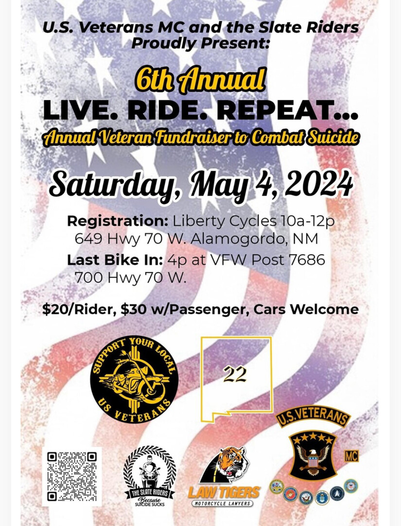Do you love motorcycles and do you want to raise awareness for suicide prevention? Then come on out for the 6th Annual Live, Ride, Repeat Veterans Suicide Awareness Ride hosted by Slate Riders and the US Veterans Motorcycle Club Trinity Chapter. Cars and Trucks are also invited: meet up at Liberty Cycles between 10 am and noon and enjoy the ride for a cause…