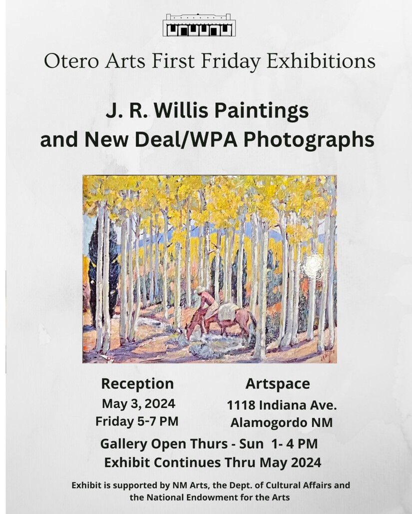This celebration will see the return of J.R. Willis’ landscapes, on loan from Otero County, which were part of the opening exhibition and reception for the Women’s Club in May 1937. The exhibit will feature the Willis paintings and reproductions of WPA art from the collection of the New Mexico National New Deal Preservation Association. During the Great Depression, New Mexican artists created murals, paintings, sculpture and buildings as part of the New Deal/WPA workforce. The opening reception is May 3rd at the Otero Artspace, 1118 Indiana Avenue, from 5 – 7pm. Gallery hours are Thursdays through Sundays (ending May 26th) from 1 – 4pm.
