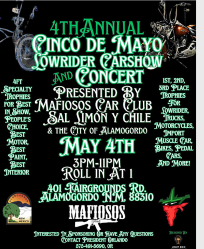 Who doesn’t love a car show? Come on out to the 2024 Lowrider Car Show and Concert When: 3 p.m. to 11 p.m. Where: Otero County Fairgrounds at 401 Fairgrounds Road. The Lowrider Car Show and Concert is hosted by the Mafiosos car club, Sal Limon y Chile, and the City of Alamogordo and will only cost $1 upon entry. A concert and dance floor will open under the pavilion at the Otero County Fairgrounds at 7 p.m. Food vendors and local shops including Cotton Valley Boutique, Sweet Tease and Sky Candy Productions will be present along with others that have not been announced.