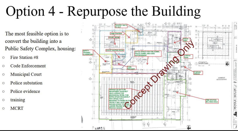 A copy of a conceptual drawing of the fun center conversion to a public safety center can be seen below…