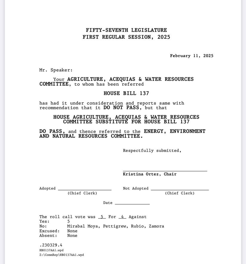 The House Agriculture, Acequias and Water Resources Committee passed House Bill 137 on a 5-4 vote.