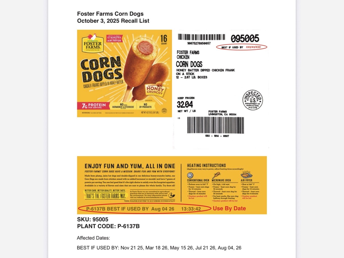 Foster Poultry Farms, LLC has issued a nationwide recall of approximately 16,000 pounds of frozen chicken corn dog products due to potential contamination with extraneous materials, according to a public health alert from the U.S. Department of Agriculture’s Food Safety and Inspection Service (FSIS). Product labels are viewable via this link