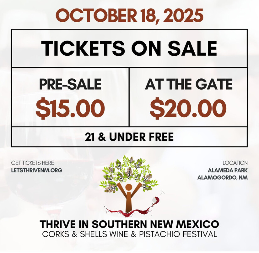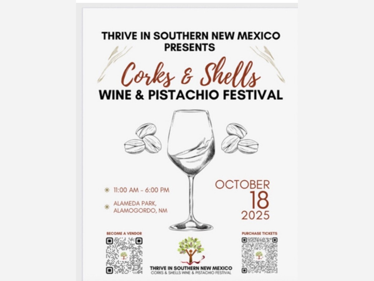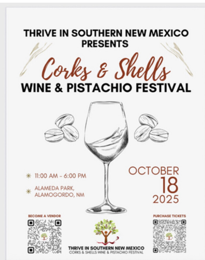 Alamogordo, NM — Come and join October 18, 2025 as Thrive in Southern New Mexico will host its First Annual Corks & Shells Wine & Pistachio Festival this Saturday at Alameda Park, offering a full day of local flavor, artisan shopping, live entertainment, and community engagement. The event runs from 11 a.m. to 6 p.m. and is expected to draw hundreds of attendees from across Otero and Lincoln Counties.