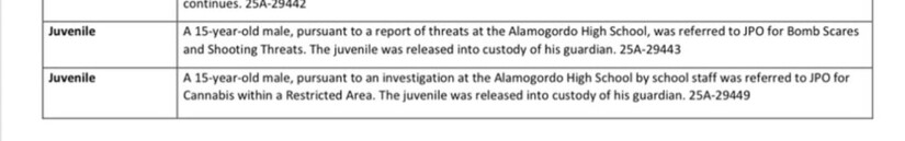• In early October, APD responded to a threat at Alamogordo High School (AHS). According to official police logs, a teenage suspect was arrested and referred to juvenile probation in connection with that incident