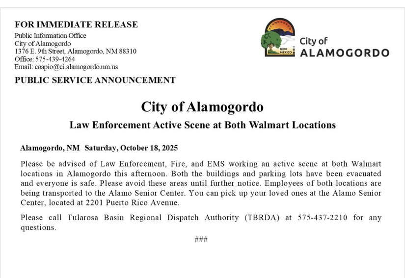 On Saturday, October 18, 2025, both Walmart locations in Alamogordo, New Mexico were evacuated following bomb threats that triggered a full-scale emergency response. The Alamogordo Police Department (APD), supported by fire and EMS crews, secured both buildings and parking lots. No injuries were reported, and all individuals were safely evacuated.