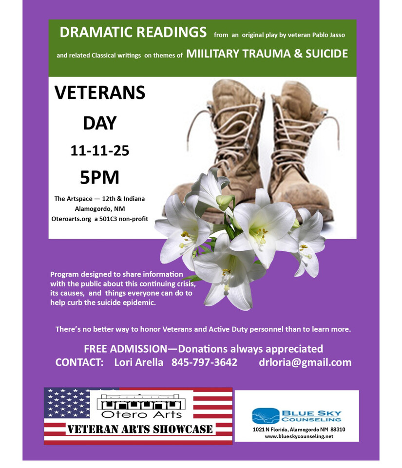 Please join Otero ArtSpace for a special Veterans Day Event TUESDAY NOVEMBER 11, 2025 at 5pm 12th, and Indiana, Alamogordo.
