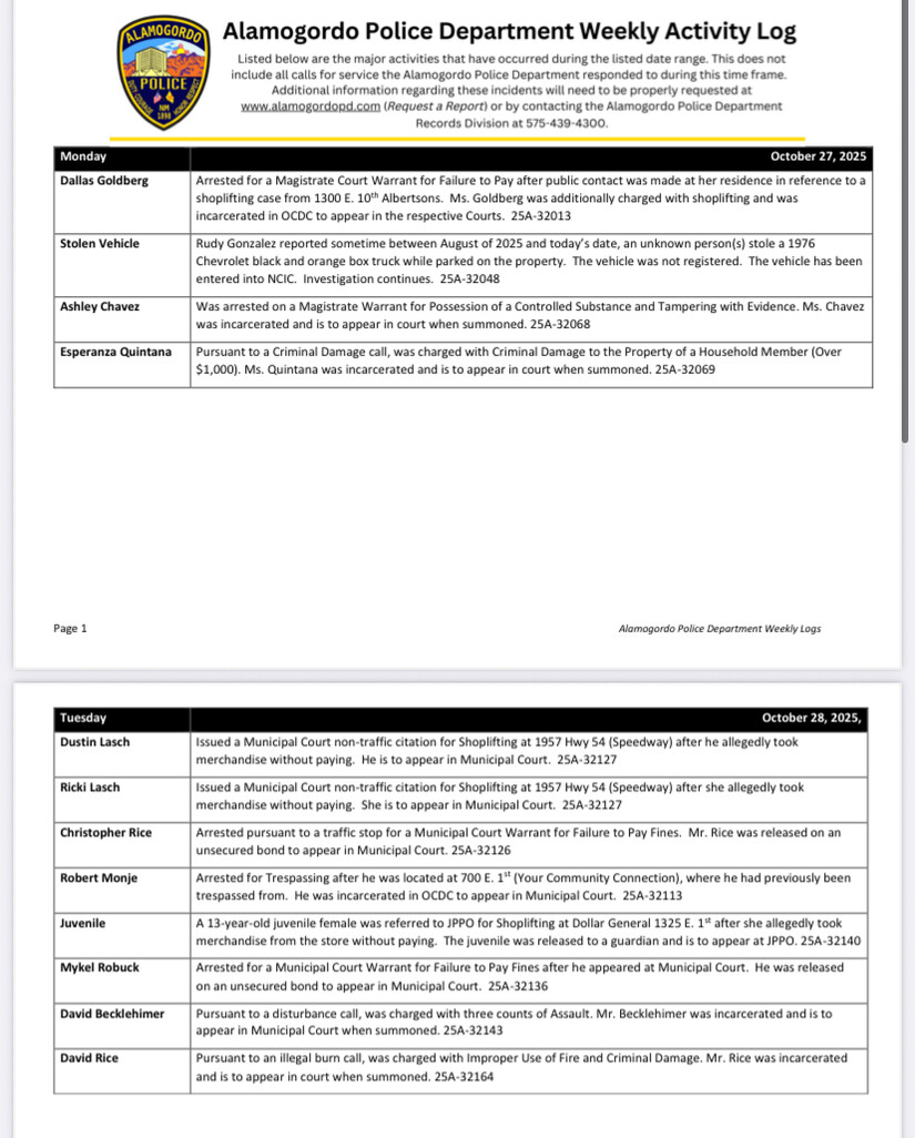 The week’s police activity highlights the importance of community vigilance, youth engagement, and continued support for law enforcement. As Alamogordo enters the holiday season, residents are encouraged to remain alert, report suspicious activity, and support efforts to foster a safer, more connected community.