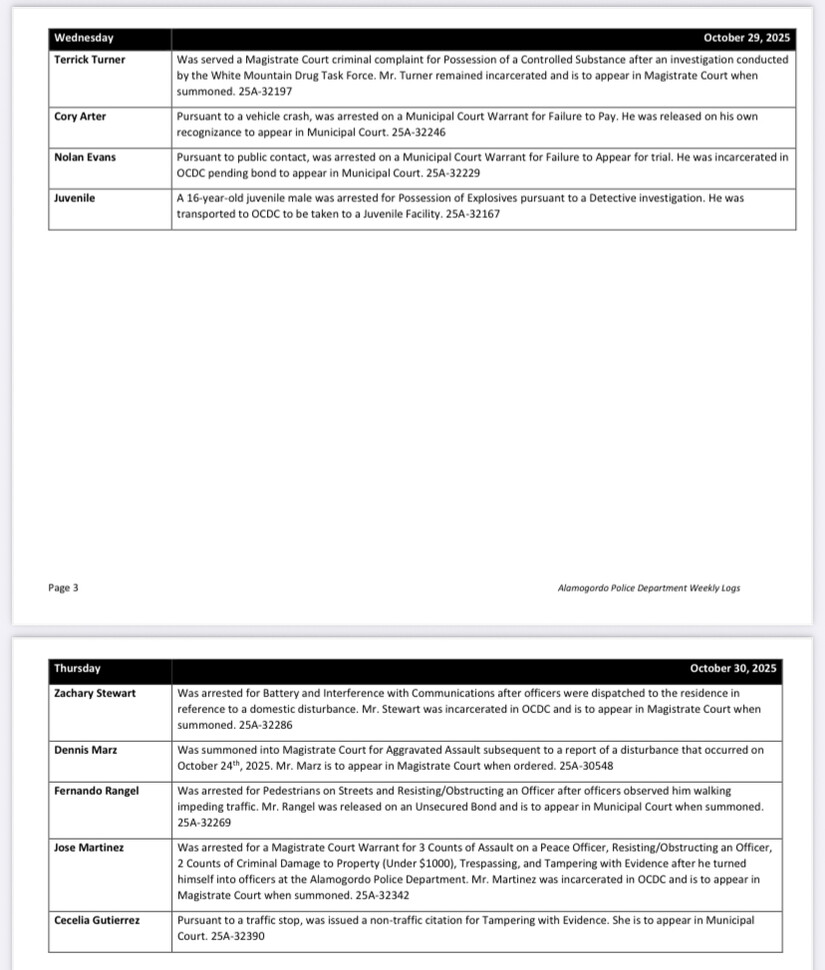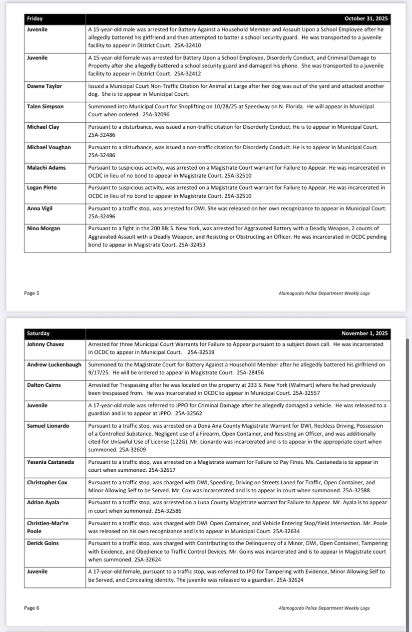 ALAMOGORDO, NM — The Alamogordo Police Department responded to a wide range of incidents during the week of October 27 through November 2, 2025, reflecting persistent challenges in public safety across the city. The week’s activity included multiple arrests and citations for assault, juvenile misconduct, drug and alcohol violations, property crimes, and outstanding warrants.