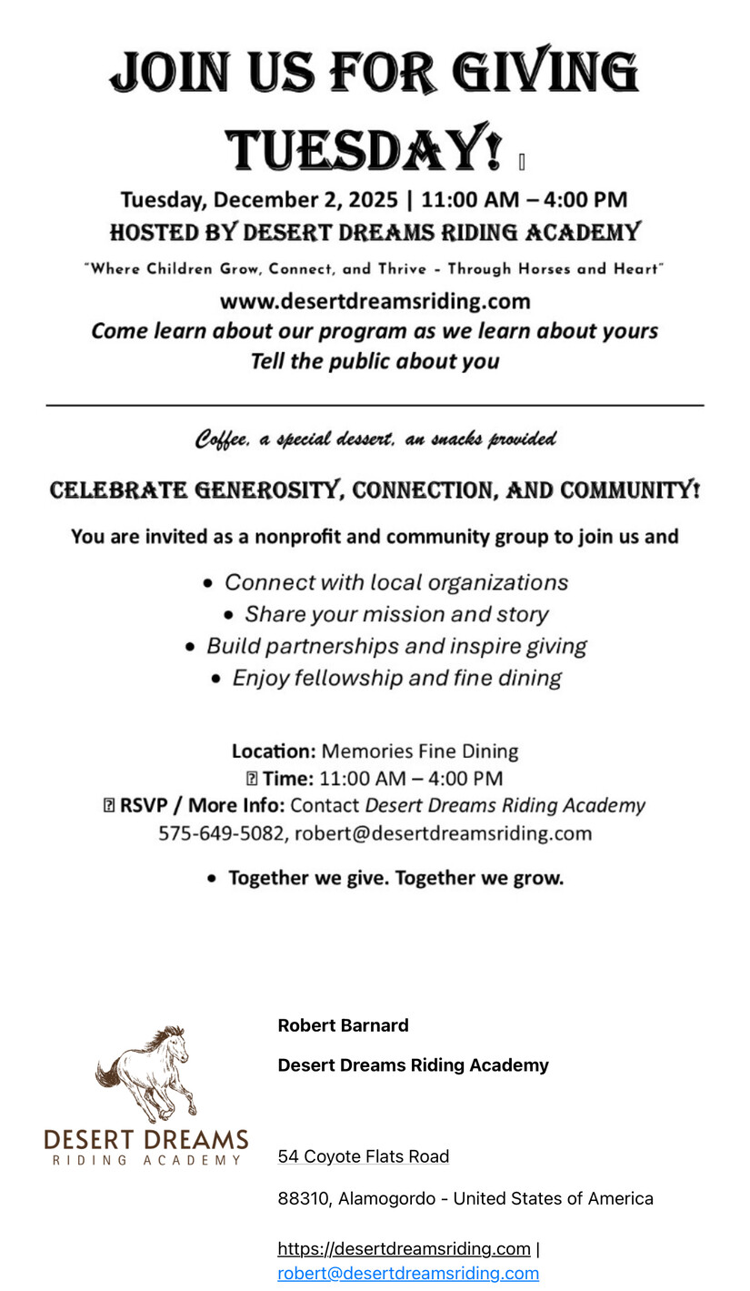 In a world often dominated by screens and stress, Desert Dreams Riding Academy offers something timeless: the healing rhythm of hooves, the wisdom of nature, and the quiet strength of a horse’s gaze. For Alamogordo’s youth, it’s more than a riding school—it’s a place to grow, connect, and thrive. As one that grew up riding horses on my grandfathers farm during the summers. This unique offering deserves attention.