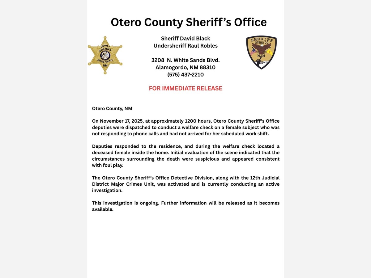 Residents with relevant information are encouraged to contact the Otero County Sheriff’s Office at (575) 437-2210. Anonymous tips may also be submitted through Crime Stoppers.