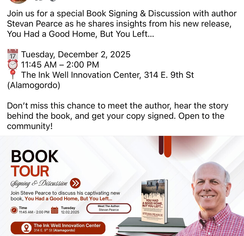 Pearce, no stranger to Alamogordo (he represented us in Congress for years and still shows up at local events), isn't writing a dry political autobiography here. This is a pilot's story – Steve flew combat missions as an Air Force captain, dodged storms in the cockpit, and navigated the turbulence of politics back home. He left a comfortable life in Hobbs, answered the call to serve, and spent decades fighting what he sees as federal overreach on everything from land management to energy policy. The book chronicles the "flight" – the highs of service and conservative victories, the storms of losses (like his 2018 Senate and gubernatorial runs), and that nagging question so many veterans and ranchers around here wrestle with: Why leave a good home?