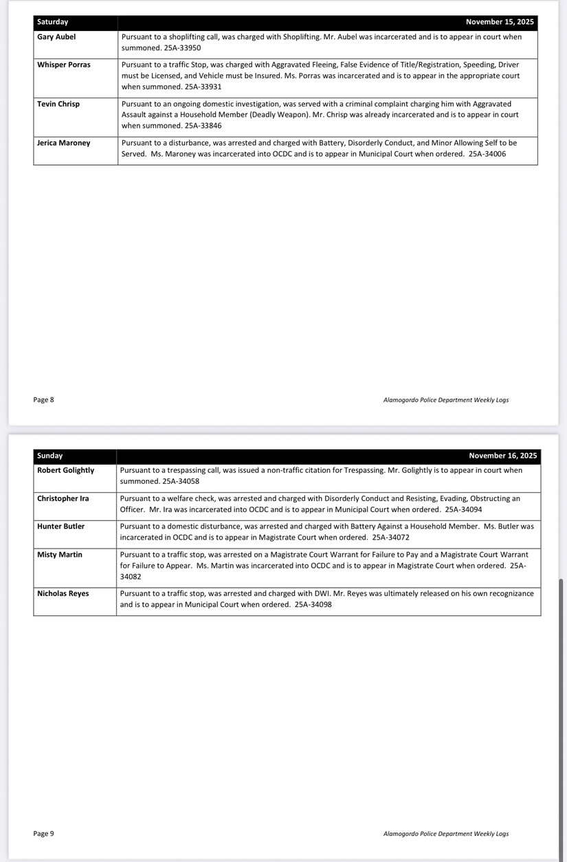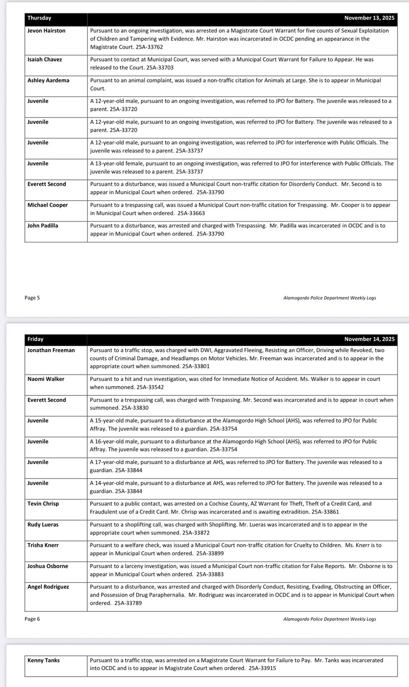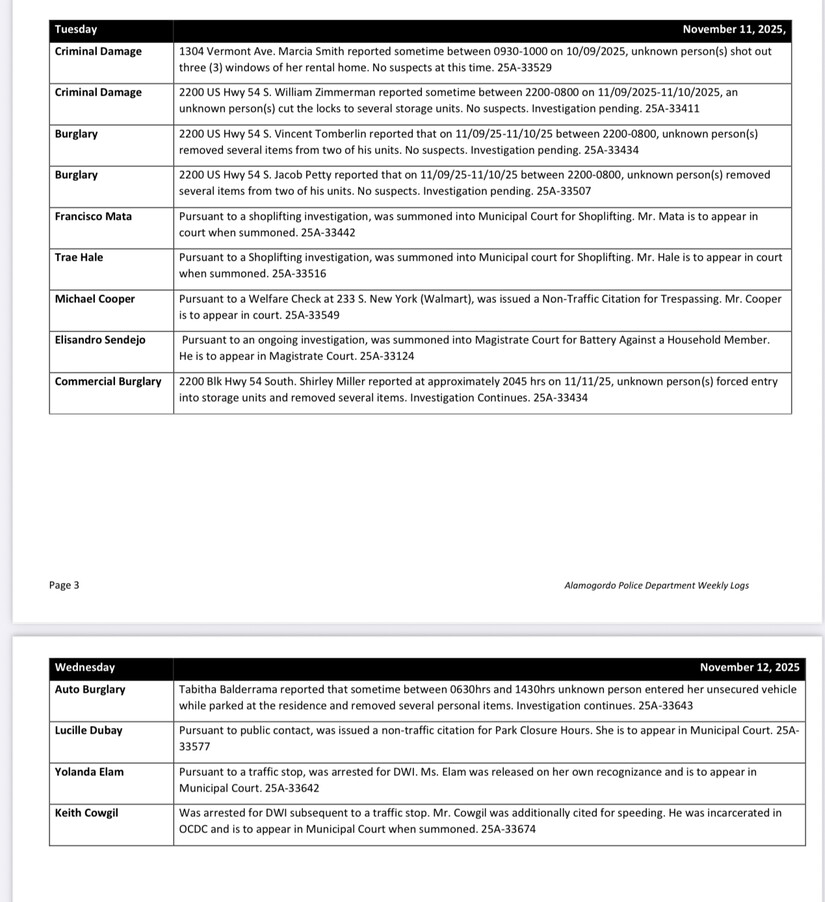 The Alamogordo Police Department released its weekly activity log covering November 10 through November 16, 2025, detailing a range of incidents from minor citations to serious felony arrests. The week saw multiple burglaries at a single storage facility, several DWI arrests, shoplifting cases, juvenile referrals stemming from school disturbances, and one high-profile child-exploitation case.