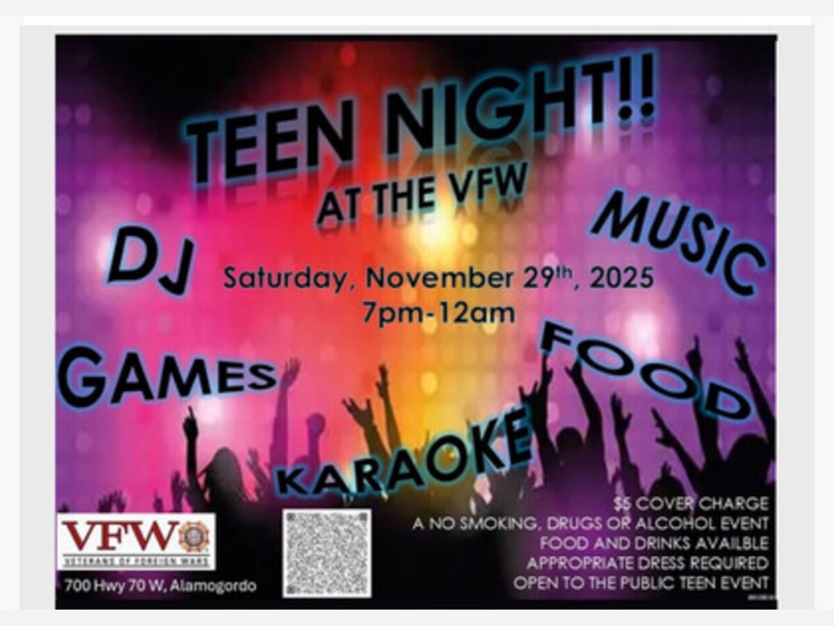 Alamogordo, NM – November 29, 2025 – While downtown celebrates Small Business Saturday, a different kind of celebration will kick off tonight on Highway 70 West: VFW Post 7686 is opening its doors for the inaugural Teen Adventure Night, a low-cost, fully supervised evening created specifically for Alamogordo’s middle and high school students.
