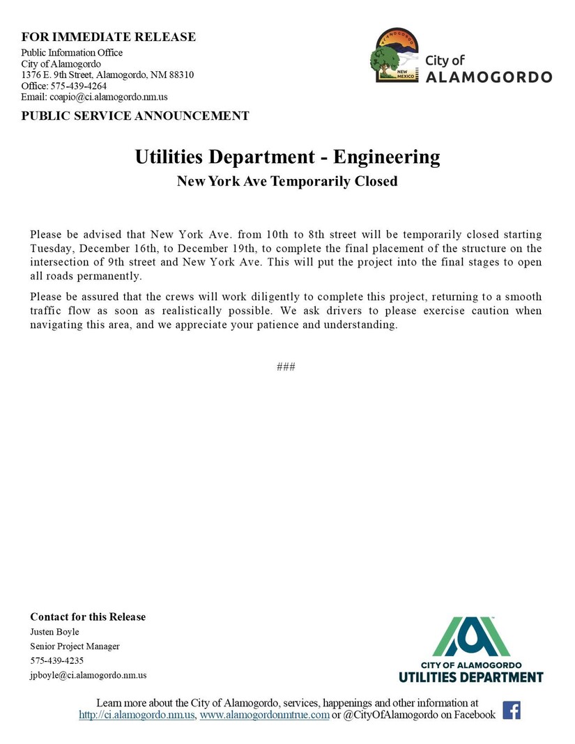 The City of Alamogordo’s Utilities Department – Engineering announced the closure in a public service release, noting that crews will work diligently to finish the project and restore smooth traffic flow. Acting City Manager, Dr. Stephanie J. Hernandez responded within an hour of receiving a press inquiry on Sunday of community concerns. AlamogordoTownNews.org received multiple text, emails and messages of concern from businesses within the district. Dr. Hernandez assured commissioners, merchants, MainStreet, city staff, and citizens of her empathy with the situation and that New York Avenue will be fully open for the critical holiday shopping week of December 17–24.