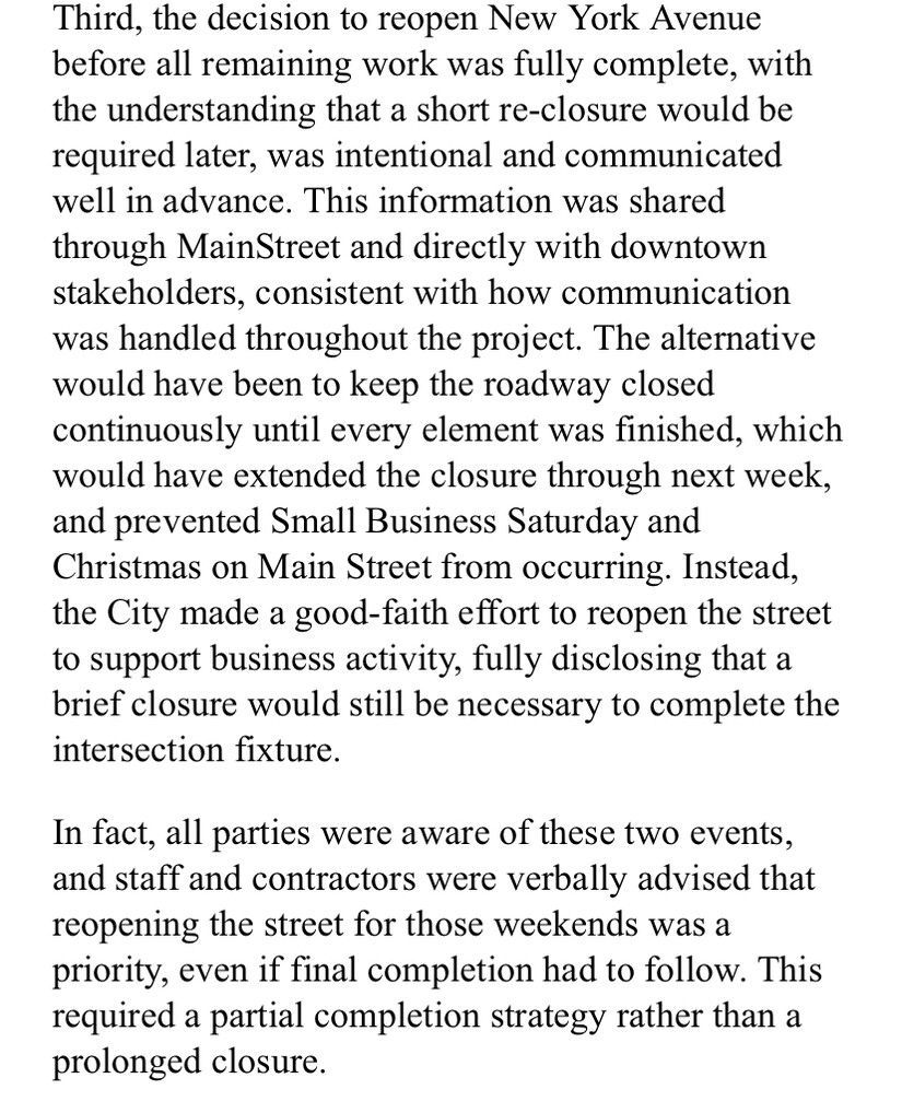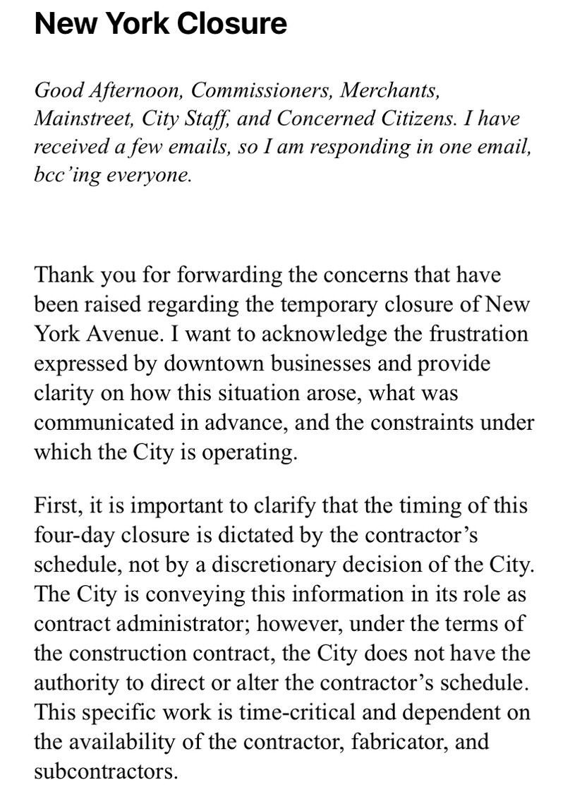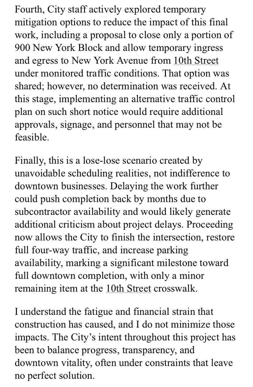 “This is not indifference—it’s a coordinated effort to finish strong, restore full traffic flow, and increase parking availability,” Dr. Hernandez wrote. “Delaying the work further could push completion back by months. Proceeding now allows the City to finish the intersection and mark a significant milestone toward full downtown completion.”