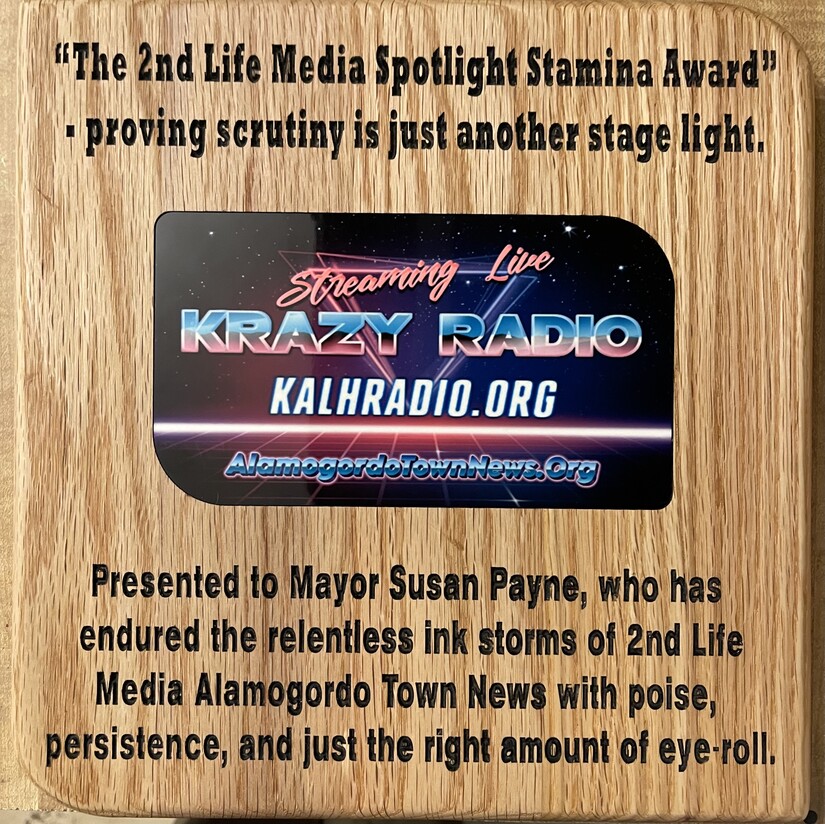 A standout moment occurred when journalist Chris Edwards from 2nd Life Media Alamogordo Town News (operating KRAZY KALH Radio and AlamogordoTownNews.org) presented Payne with a custom wooden plaque dubbed the “2nd Life Media Spotlight Stamina Award.” The inscription praised her for “enduring the relentless ink storms of 2nd Life Media Alamogordo Town News with poise, persistence, and just the right amount of eye-roll,” adding that “proving scrutiny is just another stage light.”