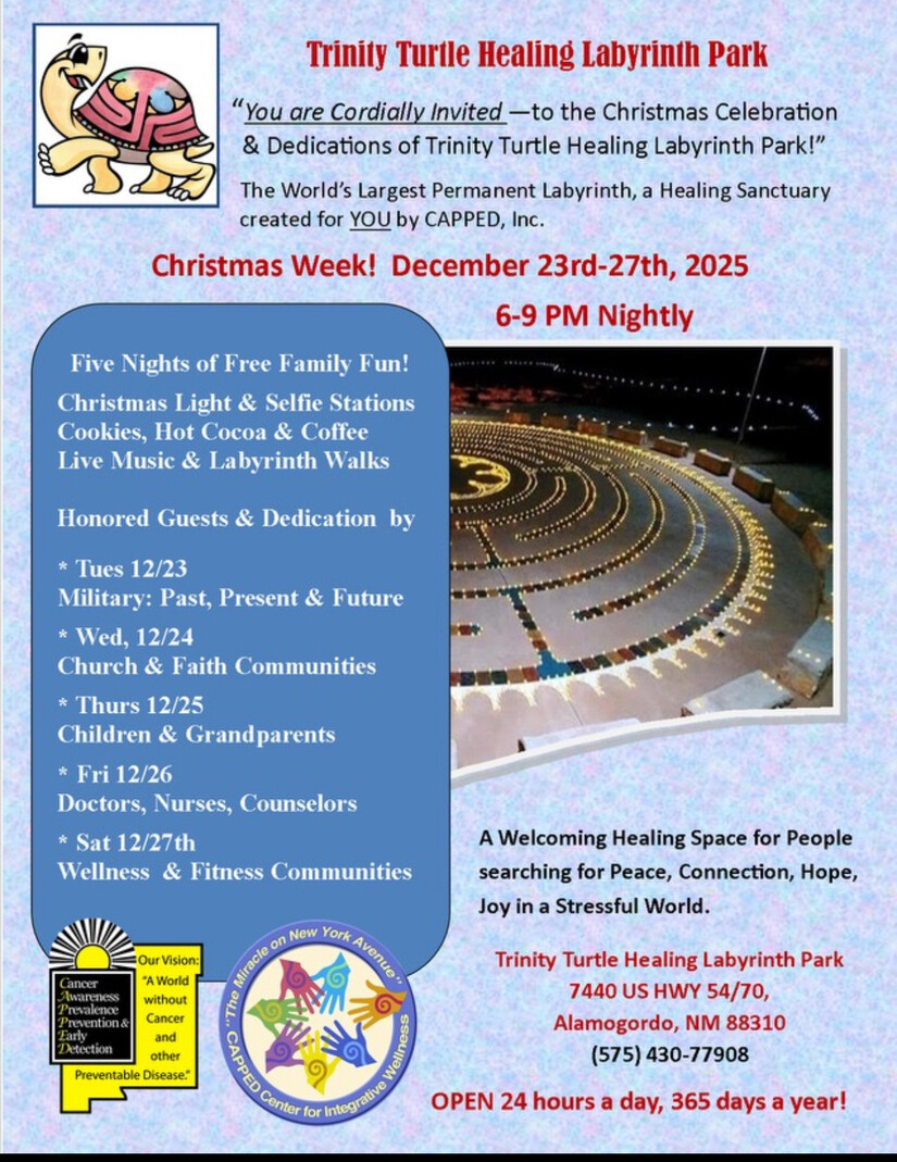 Trinity Turtle Healing Labyrinth, a healing sanctuary created by CAPPED, Inc. between Alamogordo and Tularosa is hosting special evening events.