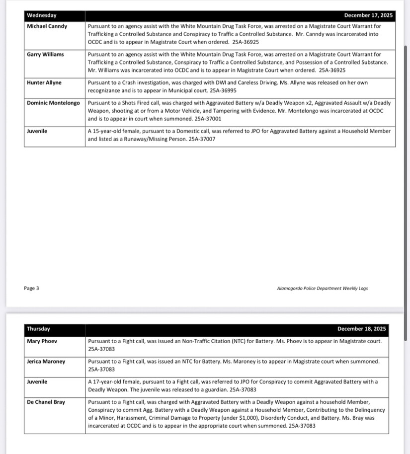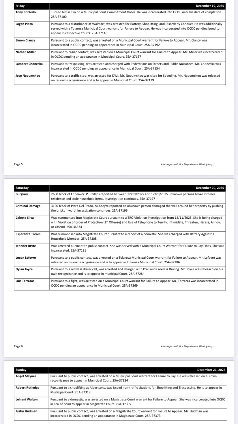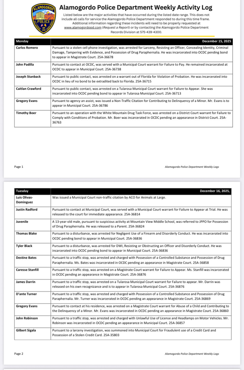 The Alamogordo Police Department handled a variety of incidents during the week of December 15 to 21, 2025, with a notable focus on drug-related offenses, warrant services, DWIs, disturbances leading to violence, and property crimes. Featured are presumed innocent until proven guilty in court.