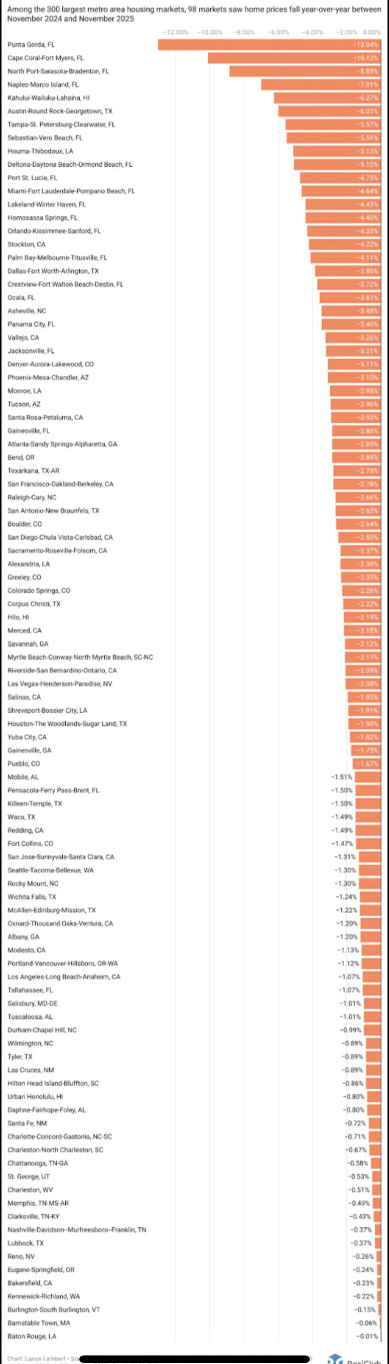 A new analysis from ResiClub, using fresh Zillow data through November 2025, shows that nationwide home prices are essentially flat, up just a meager +0.2% year-over-year. That’s a sharp slowdown from the rapid gains we’ve seen earlier this decade. The markets experiencing actual price declines are concentrated in overbuilt Sun Belt areas where inventory exploded and buyer demand cooled under higher mortgage rates.