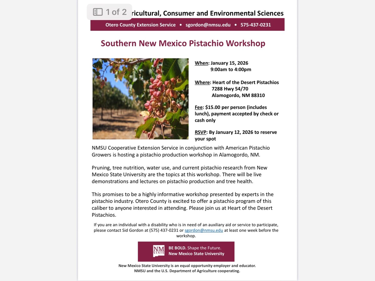 The New Mexico State University (NMSU) Cooperative Extension Service, in partnership with American Pistachio Growers, is hosting the “Southern New Mexico Pistachio Workshop” on January 15, 2026, from 9:00 a.m. to 4:00 p.m. The event will take place at Heart of the Desert Pistachios, located at 7288 Hwy 54/70, Alamogordo, NM 88310.