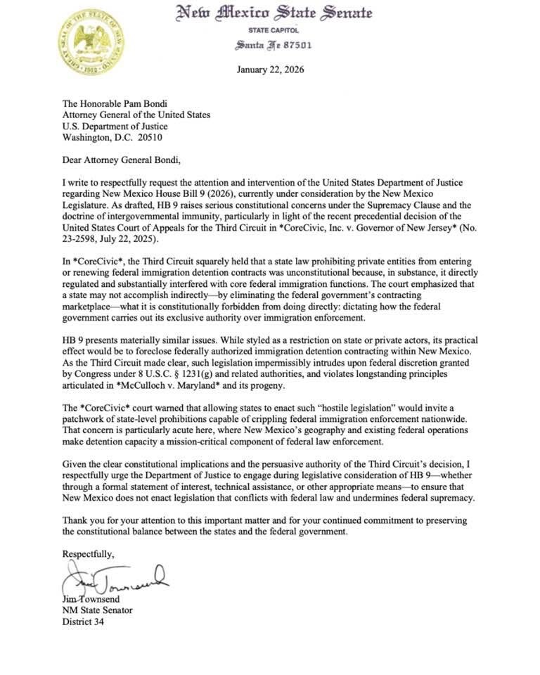In a letter dated January 22, 2026, addressed to U.S. Attorney General Pam Bondi, Townsend argues that HB 9 infringes on federal authority under the Supremacy Clause and the doctrine of intergovernmental immunity. He cites the July 2025 Third Circuit ruling in CoreCivic, Inc. v. Governor of New Jersey, which struck down state laws prohibiting private entities from contracting with federal immigration authorities. Townsend contends that HB 9 would similarly “foreclose federally authorized immigration detention contracting within New Mexico,” violating federal discretion under 8 U.S.C. § 1231(g).