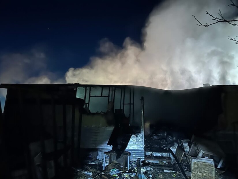 Photographs from the scene reveal the severe impact of the fire: the mobile home’s curved metal roof and side panels are heavily charred and partially collapsed, with large sections of the exterior burned away.