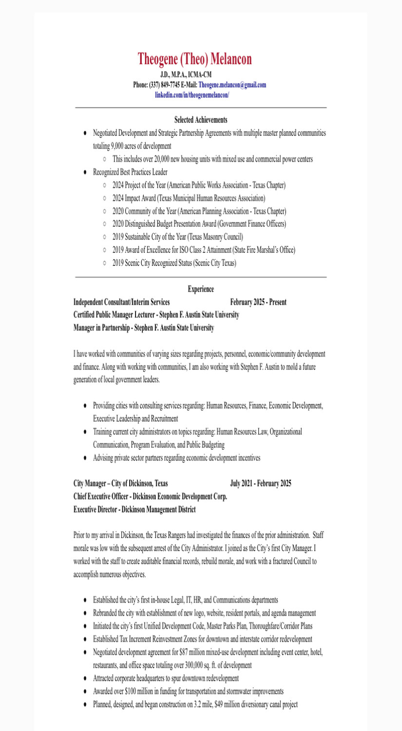 Theogene (Theo) Melancon – Former City Manager (Dickinson, TX); Current Consultant/Lecturer