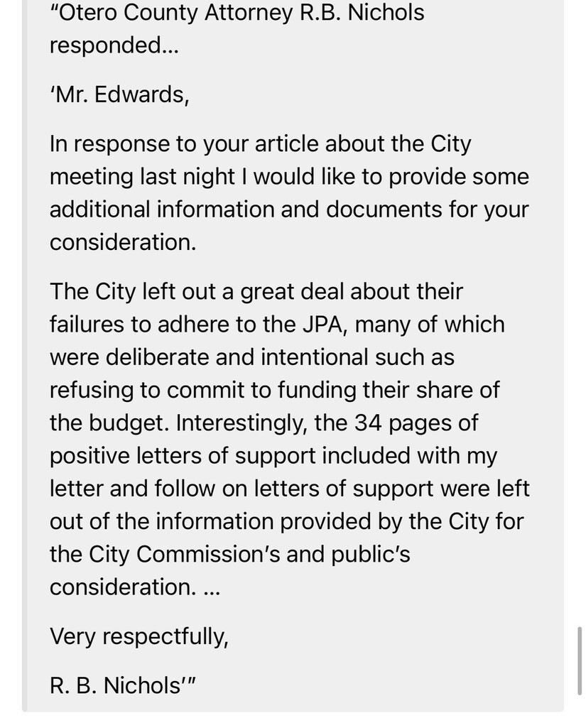 Otero County Commissioner Amy Barela and County Attorney R.B. Nichols pushed back against the city’s narrative, while city staff stood firm on their concerns which have now been further validated and vindicated.