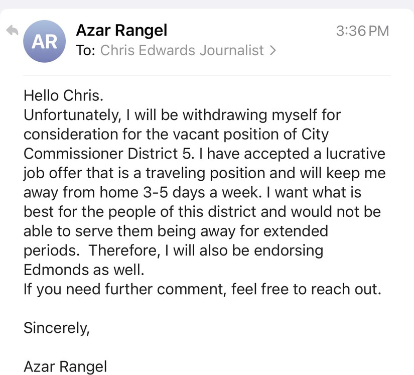 “I did not want to contend for a position that I may not be able to give 100% of the time it deserves out of respect for the citizens of District 5,” Rangel said via a spokesman in his withdrawal message, noting that the demands of his new job would limit his availability due to potential extensive travel.