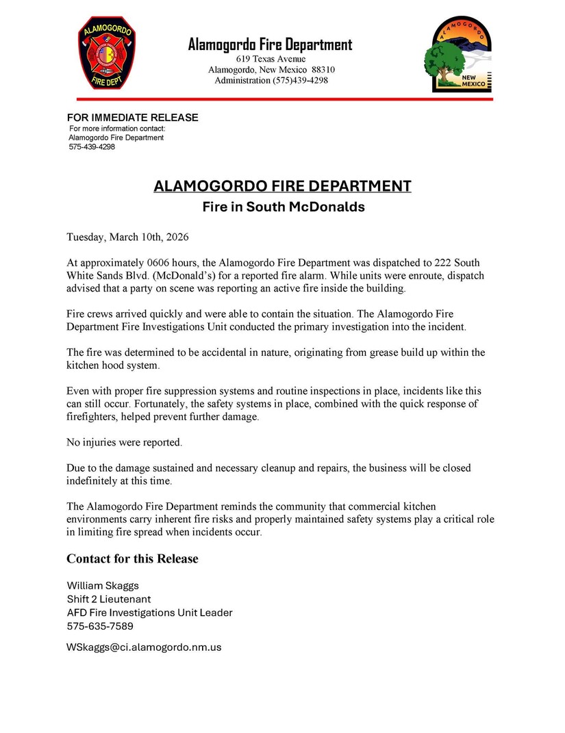 I want to extend my sincere appreciation to the Alamogordo Police Department for quickly securing the area and ensuring public safety, and to our Alamogordo Fire Department for their swift response and professionalism in containing the fire and minimizing damage. We are fortunate to have such a highly skilled and well-trained fire department serving our community.