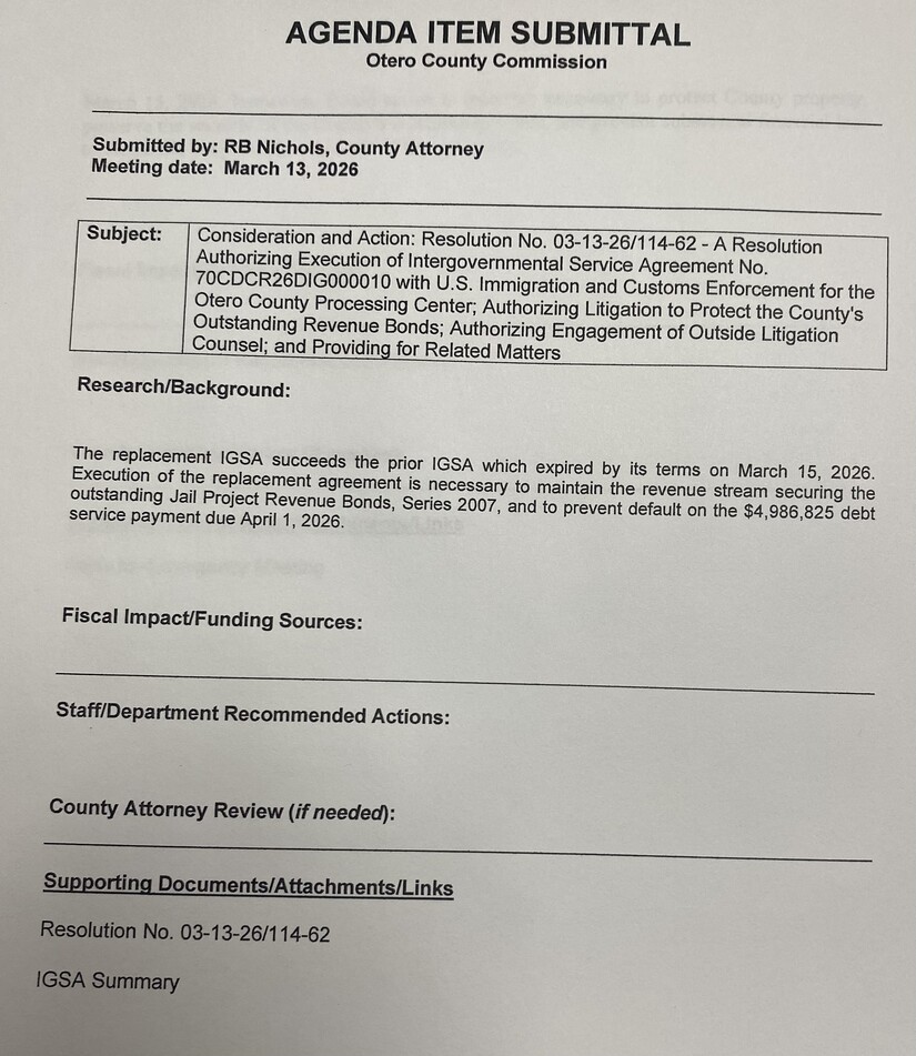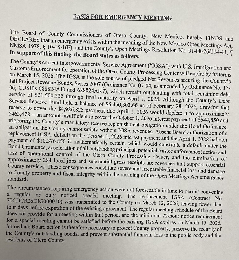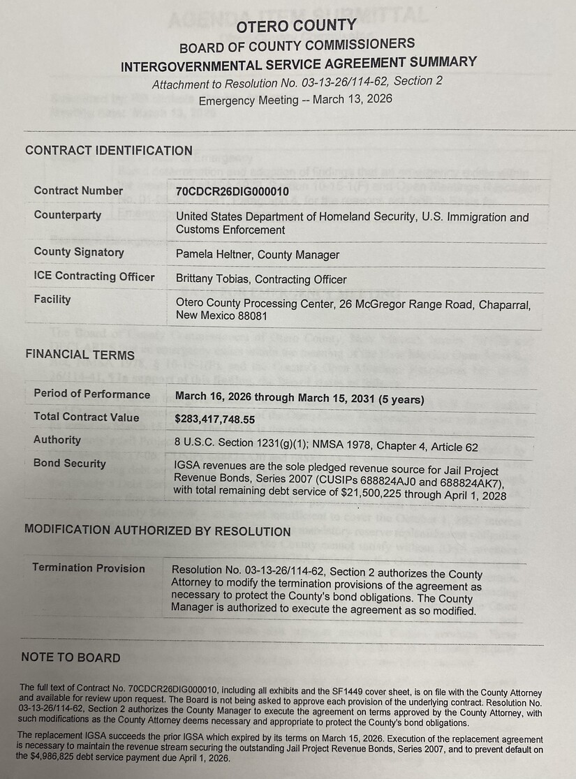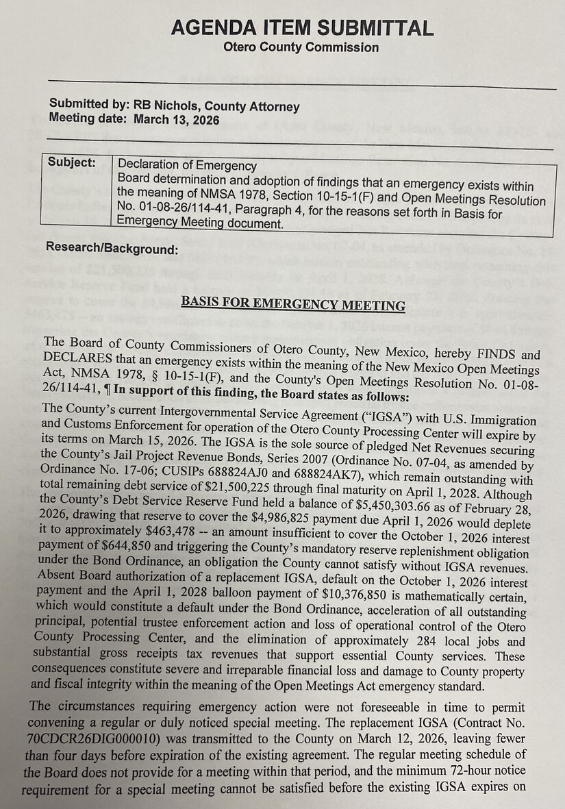 Alamogordo, N.M. (March 13, 2026) – In a swift and high-stakes last minute session at 6 pm tonight, the Otero County Board of Commissioners approved a new five-year Intergovernmental Service Agreement (IGSA) with U.S. Immigration and Customs Enforcement (ICE) for the Otero County Processing Center. The move was framed as an urgent necessity to protect the county’s outstanding jail revenue bonds and avert a looming financial catastrophe.