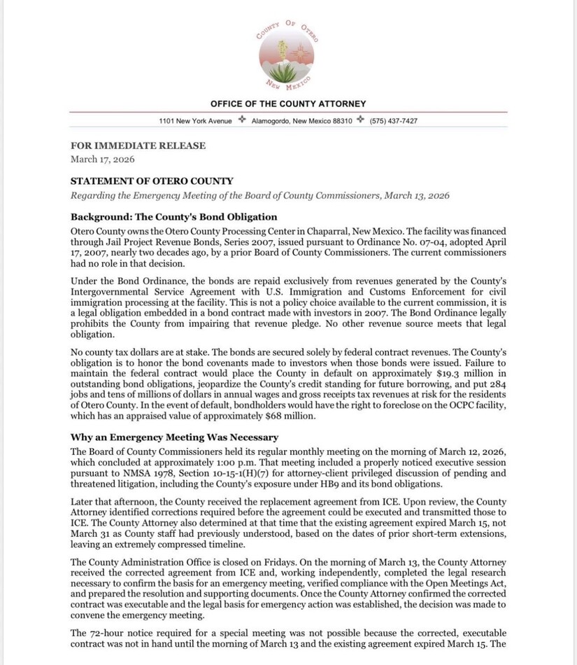 The emergency session was convened under the New Mexico Open Meetings Act to address the impending expiration of the county’s Intergovernmental Service Agreement (IGSA) with U.S. Immigration and Customs Enforcement (ICE) for the Otero County Processing Center in Chaparral. County officials declared an emergency because the replacement IGSA (Contract No. 70CDCR26DIG000010) was only transmitted to the county on March 12, leaving fewer than four days before the prior agreement expired on March 15. A standard special meeting with 72-hour notice was deemed impossible per the County Attorney.