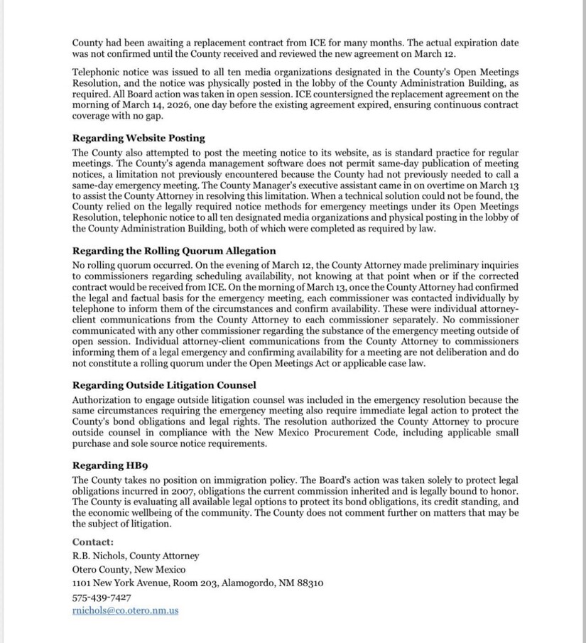 In a statement provided by County Attorney R.B. Nichols, Otero County has defended its actions and addressed several of Rep. Silva’s specific allegations: