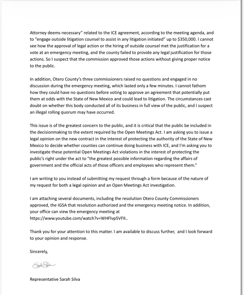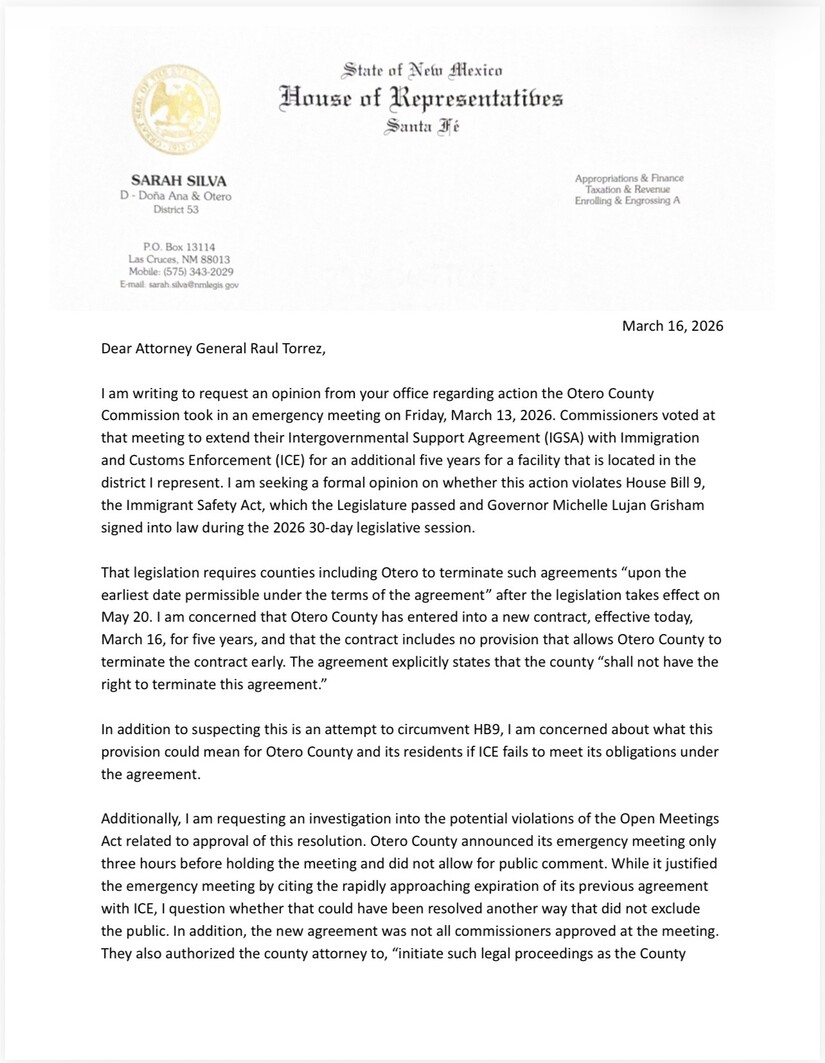Alamogordo, N.M. (March 17, 2026) – New Mexico State Representative Sarah Silva (D-District 53), representing portions of Doña Ana and Otero counties, has formally requested that Attorney General Raúl Torrez investigate and issue a legal opinion on the Otero County Board of Commissioners’ actions during a hastily called emergency meeting on Friday, March 13, 2026. In a detailed letter dated March 16, Silva accuses the commission of potentially circumventing the newly enacted Immigrant Safety Act (House Bill 9), bypassing public transparency requirements, and authorizing up to $350,000 in taxpayer-funded outside legal counsel—all with virtually no discussion or questions from the three commissioners in a meeting that lasted only about 12 minutes.