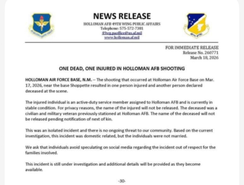 ALAMOGORDO, N.M. – Holloman Air Force Base Public Affairs has released the latest official update on the shooting that took place Tuesday, March 17, 2026, near the base Shoppette.