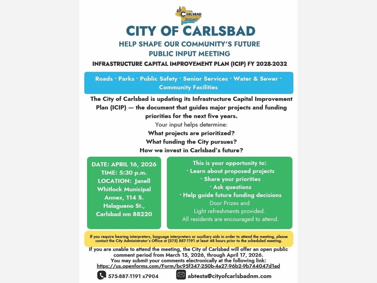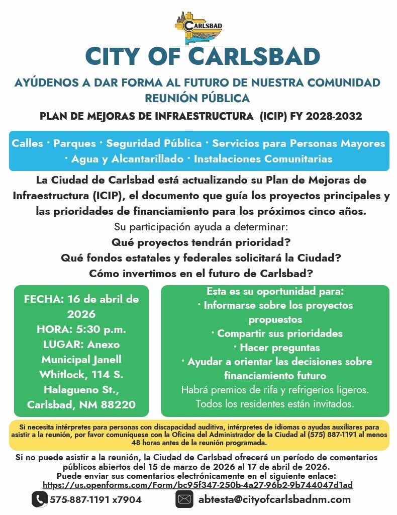 Carlsbad, NM – March 18, 2026 – The City of Carlsbad is updating its five-year Infrastructure Capital Improvement Plan (ICIP) for fiscal years 2028 through 2032 and is inviting all residents to help shape the future of community infrastructure.