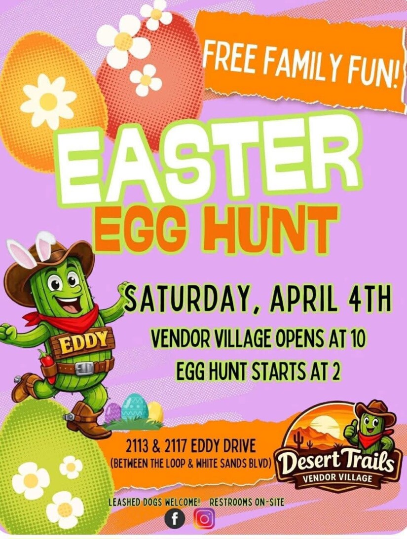 As Friday fades into Saturday, April 4th, there is free family fun with the energy shifting to even bigger adventures. Out at Desert Trails Vendor Village (2113 & 2117 Eddy Drive, between The Loop and White Sands Blvd), the Easter Egg Hunt promised free family fun. Vendor Village opening at 10:00 AM, giving shoppers a chance to browse local goods under the warm New Mexico sun.