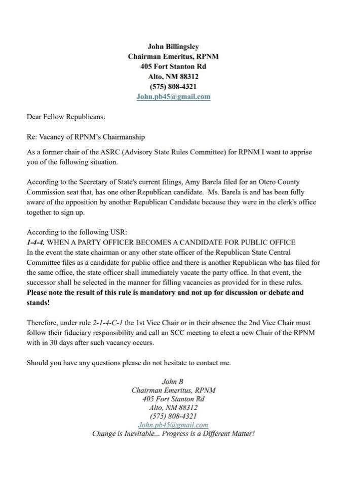 The flashpoint is Otero County Commissioner Amy Barela, the current State Chairwoman who is seeking re-election in a contested Republican primary. The governing document could not be clearer. Under Uniform State Rule 1-4-1, unchanged since at least 2001 and still in force today: