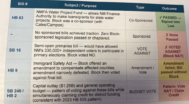 Block requests project funding for his district. Then he votes against the bill that authorizes and delivers that funding. Then he issues a press release taking credit for the money that arrives anyway, carried to Otero County by the votes of legislators who did not abstain or oppose.