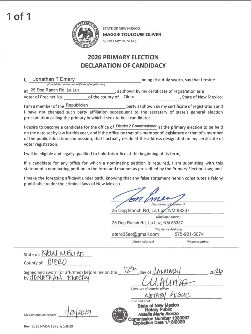 Jonathan T. Emery | Republican Primary, Otero County Commission District 2 | June 2, 2026