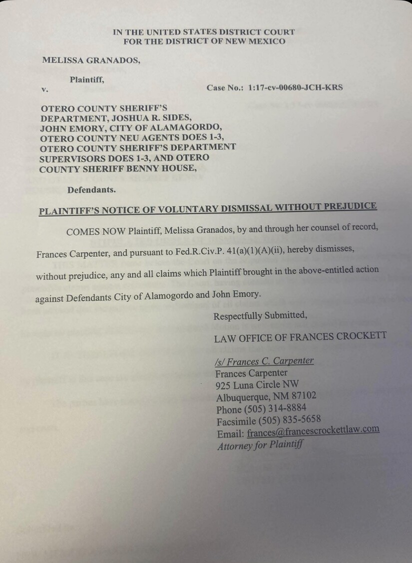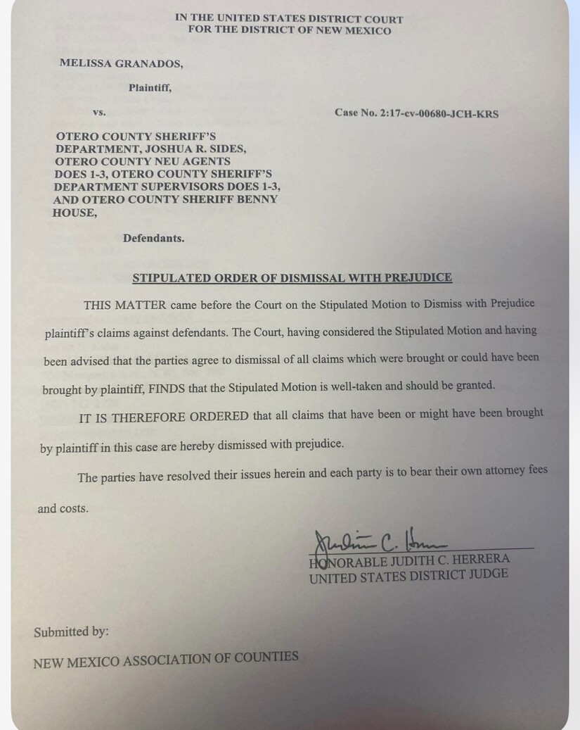 Court records show that the civil case in question, filed against the Otero County Sheriff’s Department and named individuals, was voluntarily dismissed — meaning it was resolved without any finding of wrongdoing against Emery or any other defendant. The court entered the order of dismissal with prejudice on all claims. The case is closed. There is no judgment. There is no finding. There is no adverse determination of any kind against Jonathan Emery.